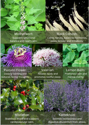 Ingredients: Black Cohosh, Kattekruid, Lemon Balm, Mistletoe, Motherwort, Passion Flower, Valerian